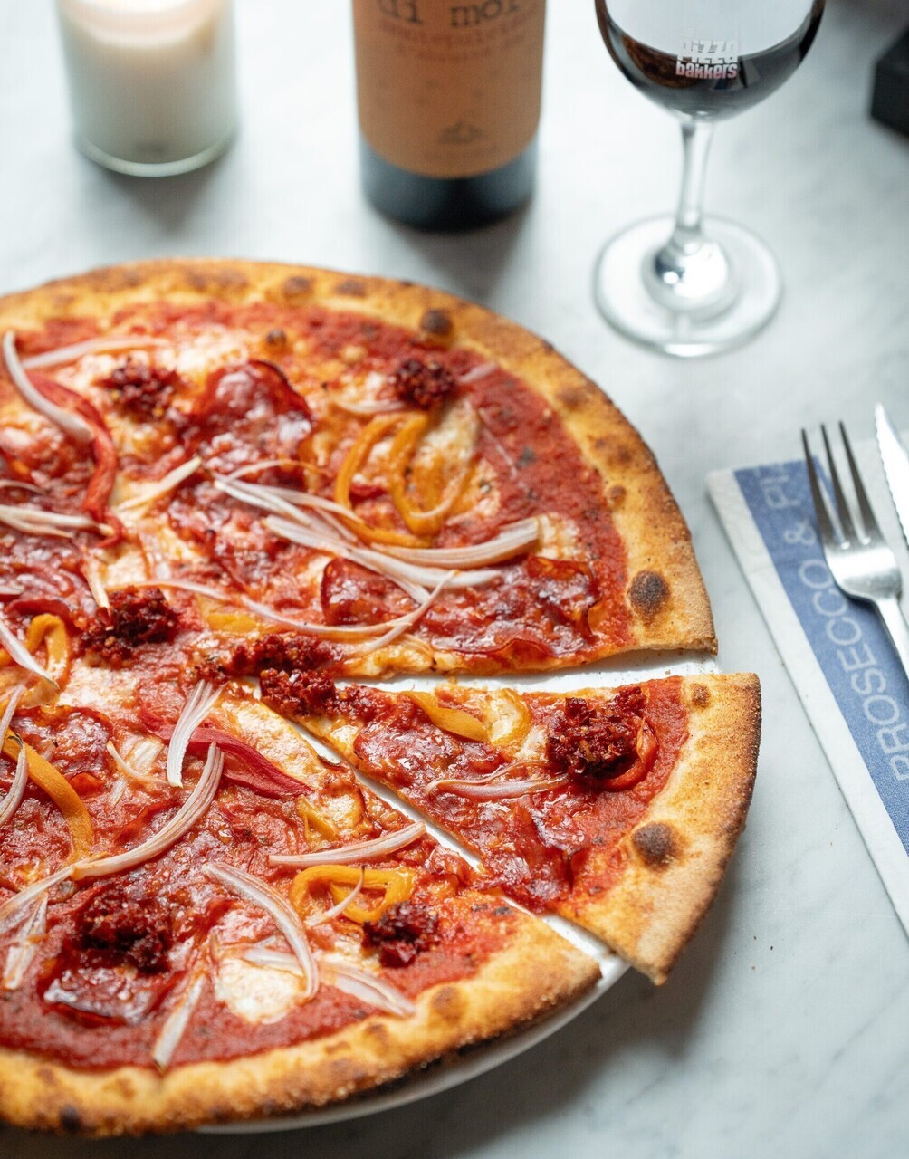 De keuken draait om authentieke Romeinse pizza’s met een dunne, krokante bodem die met zorg in de houtoven worden gebakken. Verse tomatensaus, romige mozzarella en zorgvuldig geselecteerde ingrediënten zoals pittige salami, gegrilde groenten en geurige basilicum zorgen voor pure, heldere smaken. Elk gerecht ademt de eenvoud en kwaliteit van de Italiaanse traditie, met een eigentijdse finesse die perfect past bij de omgeving.