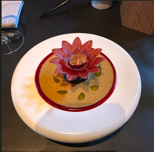 voorgerecht heel apart, maar de verschillende smaken waren verrukkelijk! als hoofdgerecht hadden we varkensnek, klinkt niet echt gezellig, maar de smaak was super. een kleurenpalet op een lei-stenenbord. de bombe van ganzenlever met framboos helemaal af. we komen graag nog een keertje van de kunsten van de chefkok genieten.